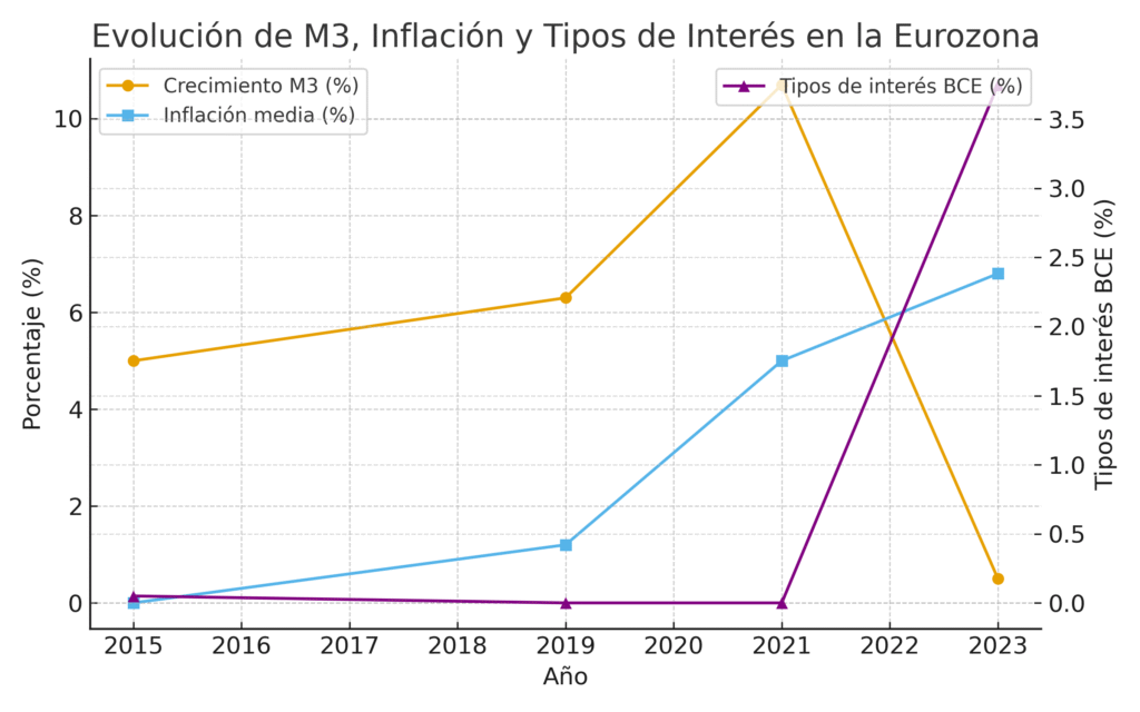 | Año | Crecimiento M3 (masa monetaria en la eurozona) | Inflación media (%) | Tipos de interés BCE (%) |